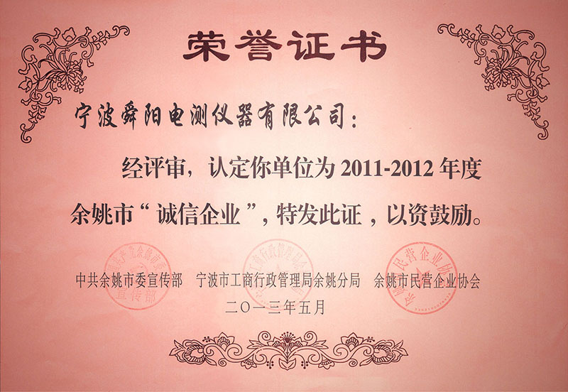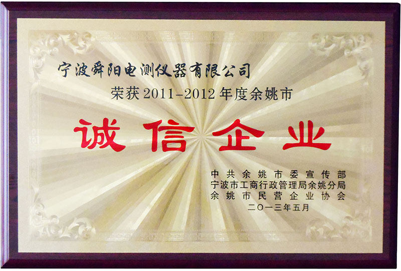 2013年5月,被中共余姚市委宣傳部、寧波市工商行政管理局余姚分局、余姚市民營企業(yè)協(xié)會(huì)聯(lián)合評定為2011-2012年度余姚市“誠信企業(yè)”